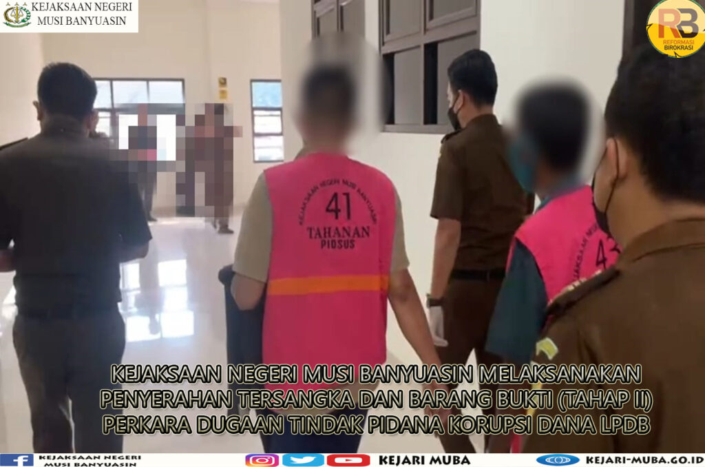 Pada hari rabu tanggal 4 Agustus 2021 telah di laksanakan penyerahan tersangka dan barang bunti (tahap II) An. Safaruddin, Alis Gunawan dan Bambang Trihasmoro oleh Penyidik Pidsus Kejaksaan Negeri Musi Banyuasin kepada penuntut Umum Kejaksaan Negeri Musi Banyuasin dan terhadap tersangka Alis Gunawan dan Bambang Trihasmoro dilakukan penahanan selama 20 (Dua Puluh) Hari teritung sejak tanggal 4 Agustus 2021 s/d 23 Agustus 2021. Sedangkan untuk tersangka Safaruddin tidak hadir memeuhi panggilan, namun ketidakhadiran tersangka tidak menghambat proses penuntutan. Selanjutnya penuntut umum akan mempersiapkan Berkas Perkara untuk dilimpahkan ke Pengadilan.