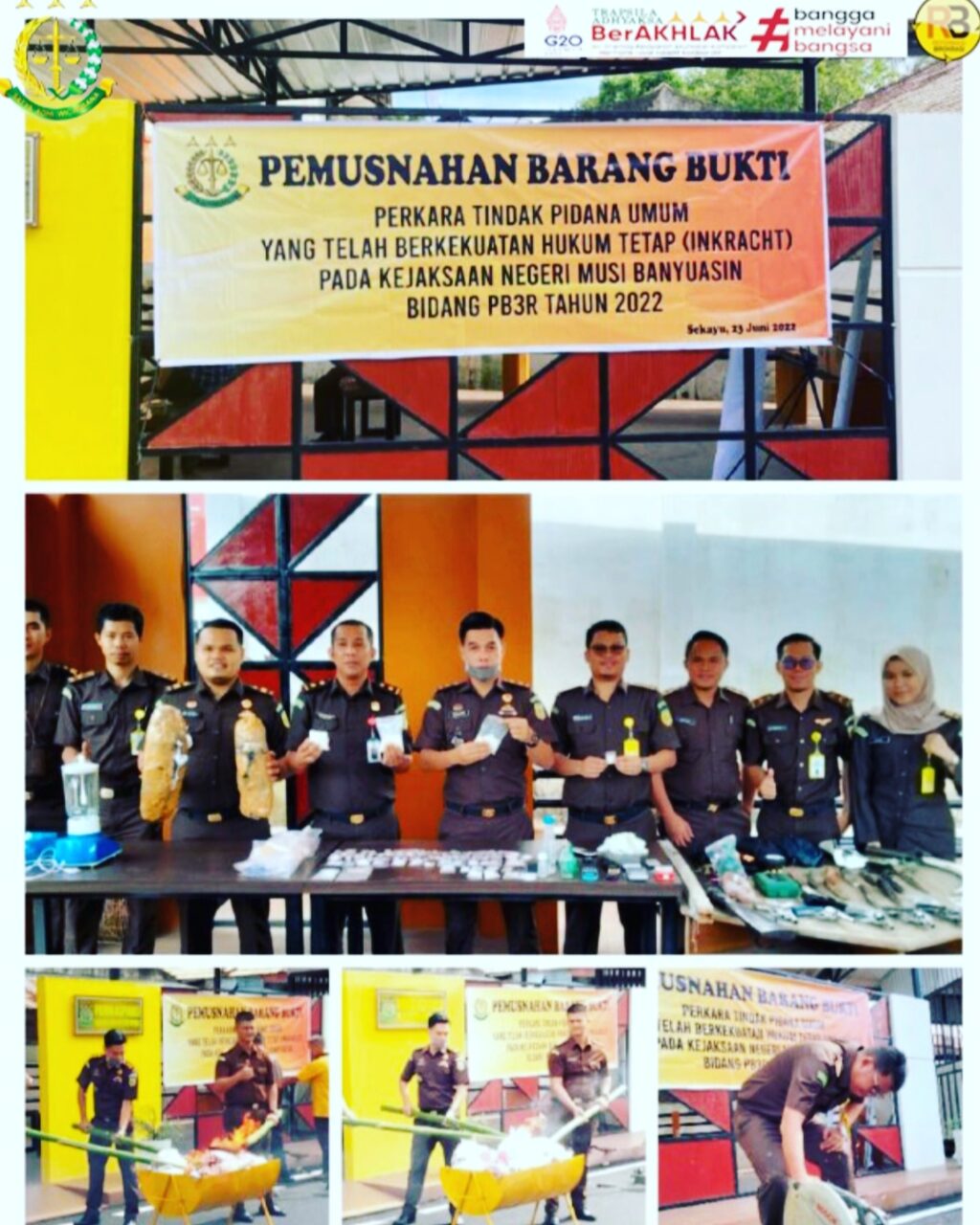 Kamis 23 Juni 2022 Kepala Seksi Pengelolaan Barang Bukti & Barang Rampasan (PB3R) Kejaksaan Negeri Musi Banyuasin Firmansyah, SH di dampingi Kepala Seksi Tindak Pidana Umum, Habibi, SH, serta bersama para Jaksa melakukan giat Pemusnahan Barang Bukti Perkara Tindak Pidana Umum yang telah memiliki kekuatan hukum tetap (inkracht).