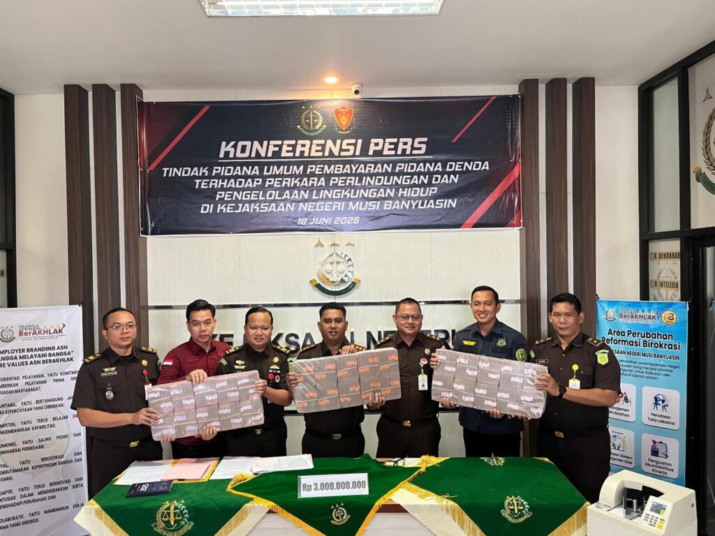 Rabu, Tanggal 18 Juni 2025 sekira pukul 08:00, Telah dilaksanakan Konferensi Pers pengembalian pembayaran pidana denda uang sebesar Rp. 3.000,000,000,00 (tiga miliar rupiah) terhadap perkara perlindungan dan pengelolaan lingkungan hidup di kejaksaan negeri musi banyuasin