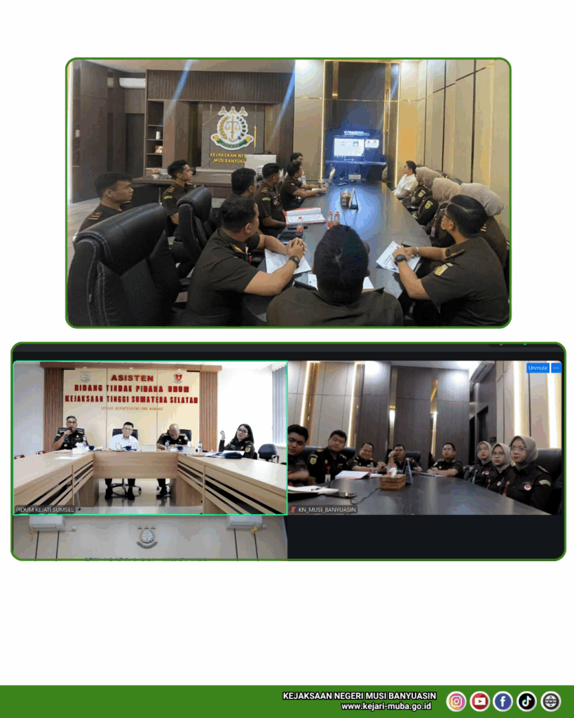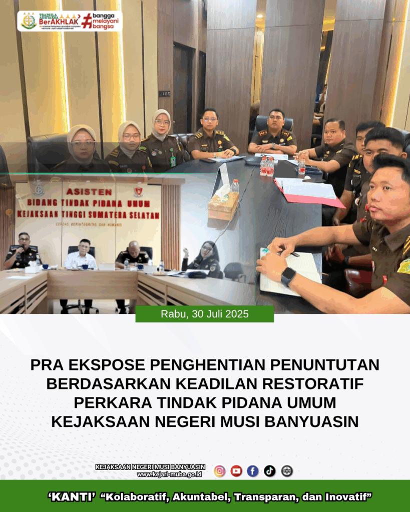 Pada hari hari Rabu, 30 Juli 2025, Pukul 13.00 Wib s.d selesai, bertempat di Ruang Kepala Kejaksaan Negeri Musi Banyuasin, telah dilaksanakan Pra Ekspose perkara tindak pidana umum dalam rangka pengajuan penghentian penuntutan berdasarkan keadilan restoratif. Kegiatan ini diselenggarakan secara virtual melalui zoom meeting dan diikuti secara langsung oleh jajaran Kejaksaan Negeri Musi Banyuasin dan Kejaksaan Tinggi Sumatera Selatan. Bahwa kegiatan tersebut dihadiri : Wakil Kepala Kejaksaan Tinggi Sumatera Selatan Bapak Dr. Sumurung Pandapotan Simaremare S.H.,M.H., Asisten Tindak Pidana Umum Kejaksaan Tinggi Sumatera Selatan Bapak Dandeni Herdiana, S.H.,M.H., Kepala Kejaksaan Negeri Musi Banyuasin Bapak Aka Kurniawan, S.H.,M.H., Koordinator Bidang Tindak Pidana Umum Kejaksaan Tinggi Sumatera Selatan Bapak Dr. Erwin Indrapraja, S.H., M.H., Kasi A Bidang Pidana Umum Kejaksaan Tinggi Sumatera Selatan Ibu Qori, Kepala Seksi Tindak Pidana Umum Kejaksaan Negeri Musi Banyuasin Bapak Didi Aditya Rustanto, S.H.,M.H., Jaksa Fasilitator Kejaksaan Negeri Musi Banyuasin, Para pegawai formasi Calon Jaksa di Kejaksaan Negeri Musi Banyuasin.