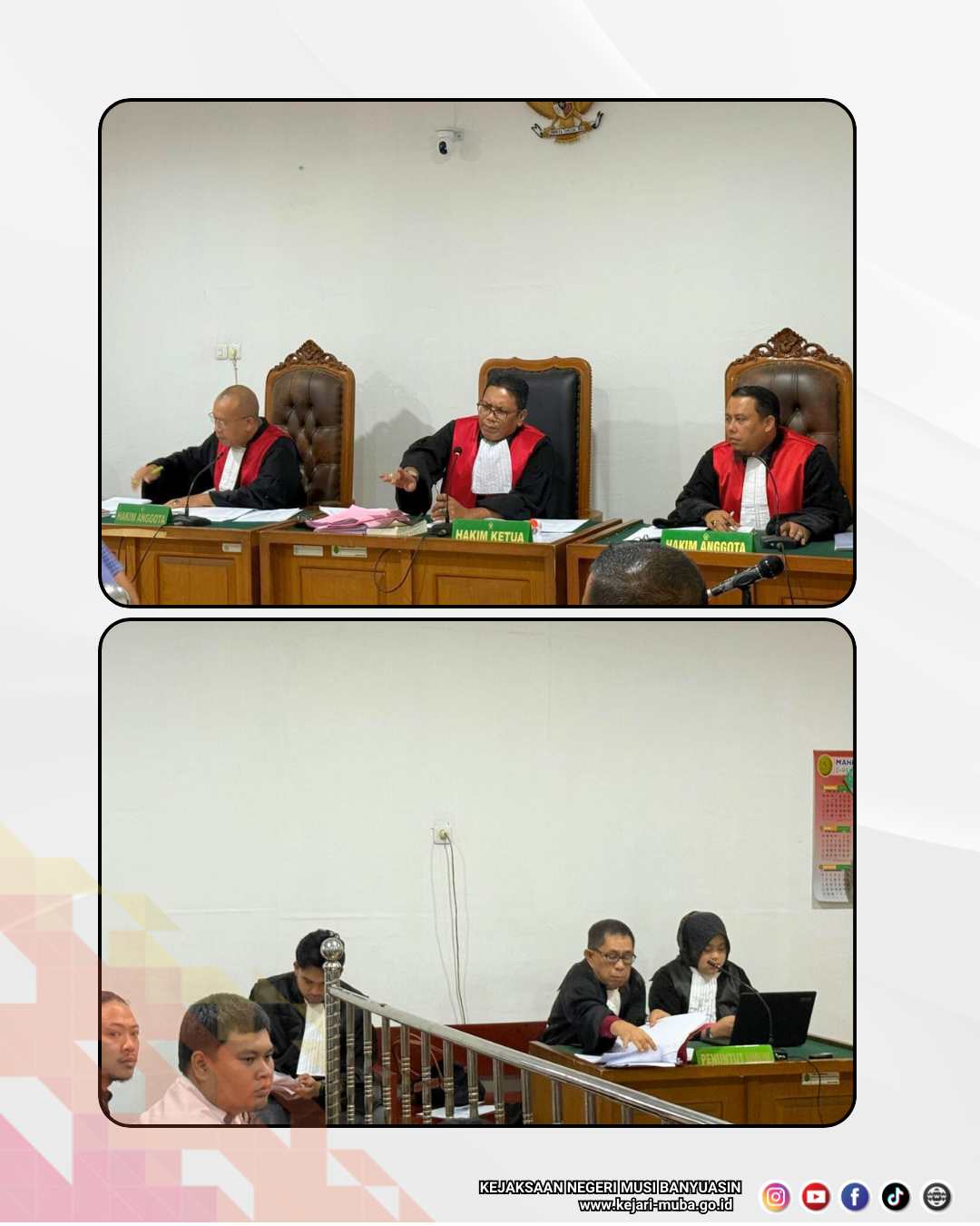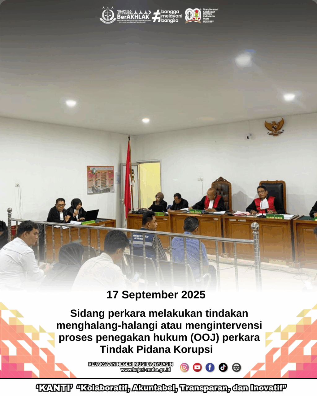 Pada Hari Rabu tanggal 17 September 2025 pukul 11.00 wib s/d selesai di Pengadilan Negeri Kelas 1A Palembang telah dilaksanakan Sidang perkara melakukan tindakan menghalang-halangi atau mengintervensi proses penegakan hukum (OOJ) perkara Tindak Pidana Korupsi terkait Kegiatan Pembuatan dan Pengelolaan Jaringan/Instalasi Komunikasi dan Informasi Lokal Desa pada Dinas Pemberdayaan Masyarakat Desa (DPMD) Kabupaten Musi Banyuasin tahun 2019–2023. Bahwa Para Terdakwa yang menjalani Persidangan Hari Ini adalah : MO dan MA