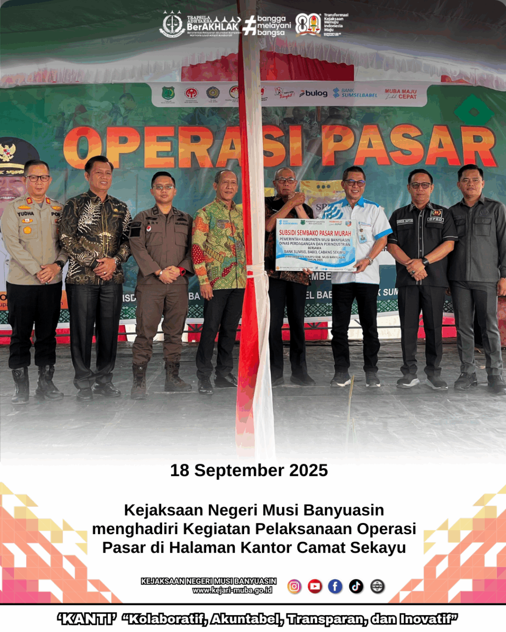 Kamis tanggal 18 September 2025 Pukul 09.00 WIB telah diadakan kegiatan Pelaksanaan Operasi Pasar yang di selenggarakan oleh Dinas Perdagangan dan Perindustrian Kab. Musi Banyuasin yang bertempat di Halaman Kantor Camat Sekayu.