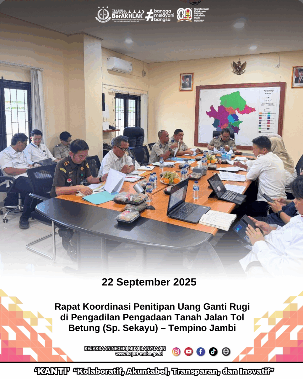 Senin, 22 Agustus 2025, Pukul 14:00 WIB s.d selesai, bertempat di Kantor Pertanahan Kabupaten Musi Banyuasin telah diadakan Rapat Koordinasi Penitipan Uang Ganti Rugi di Pengadilan Pengadaan Tanah Jalan Tol Betung (Sp. Sekayu) – Tempino Jambi.