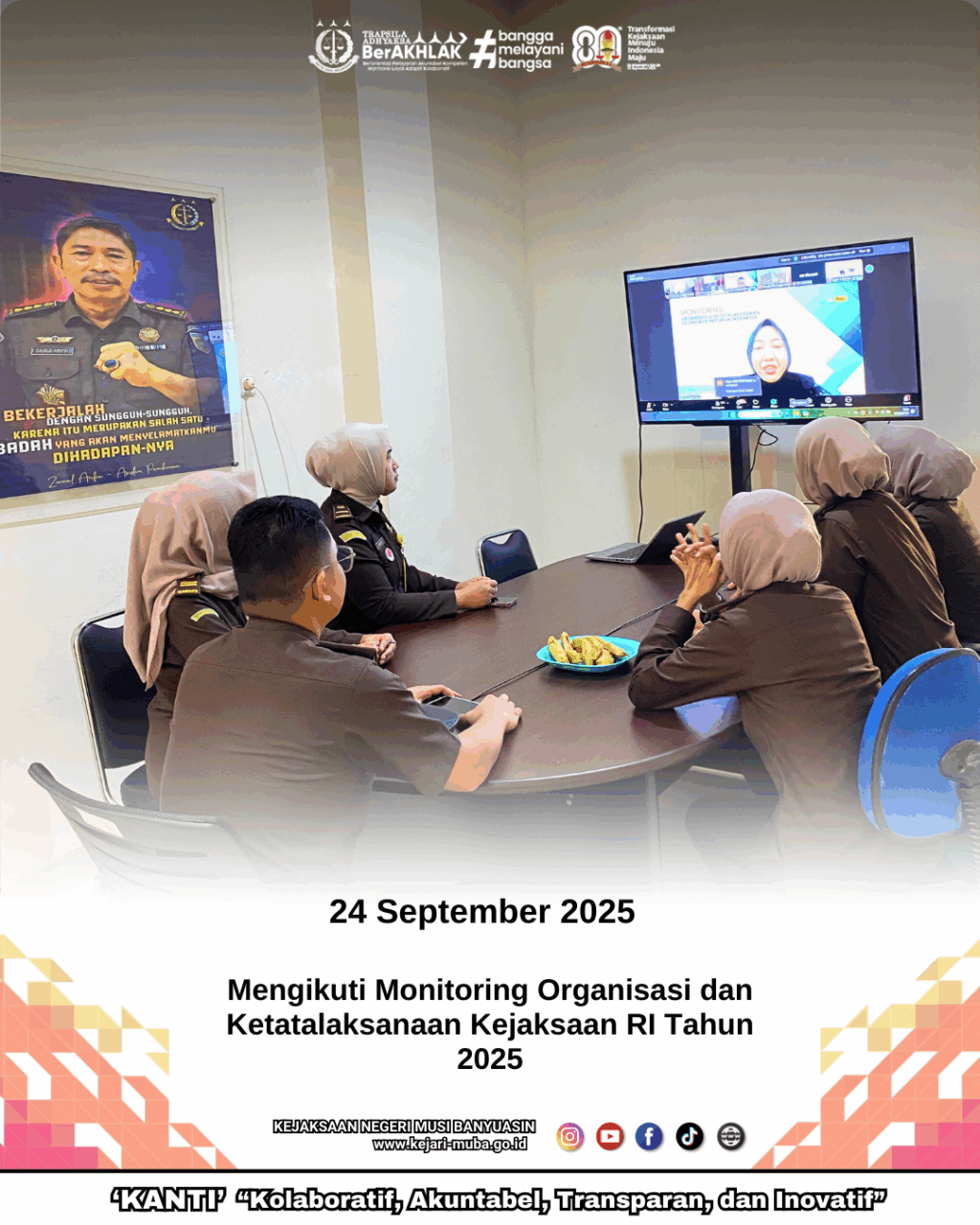 Rabu, 24 September 2025, Pukul 09.00 WIB s/d selesai, Bidang Pembinaan Kejaksaan Negeri Musi Banyuasin mengikuti kegiatan Monitoring Organisasi dan Ketatalaksanaan Kejaksaan RI Tahun 2025 melalui zoom meeting.