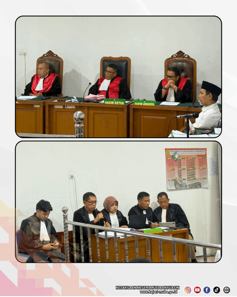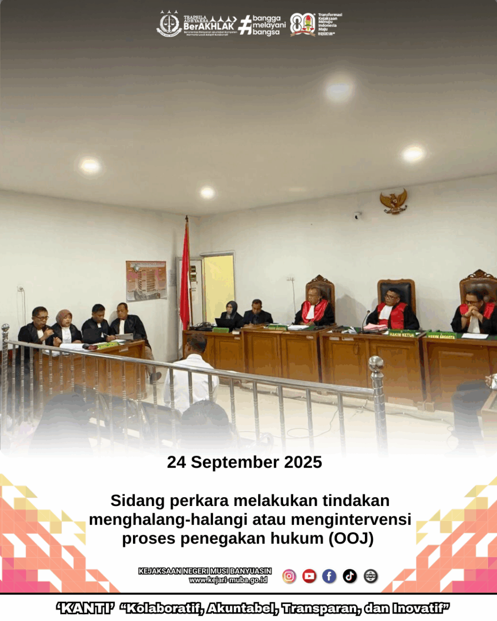 Rabu tanggal 24 September 2025 pukul 14.00 wib s/d selesai di Pengadilan Negeri Kelas 1A Palembang telah dilaksanakan Sidang perkara melakukan tindakan menghalang-halangi atau mengintervensi proses penegakan hukum (OOJ) perkara Tindak Pidana Korupsi terkait Kegiatan Pembuatan dan Pengelolaan Jaringan/Instalasi Komunikasi dan Informasi Lokal Desa pada Dinas Pemberdayaan Masyarakat Desa (DPMD) Kabupaten Musi Banyuasin tahun 2019–2023. Para Terdakwa yang menjalani Persidangan Hari Ini adalah MO & MA. Agenda sidang yang dilaksanakan hari ini adalah mendengarkan Keterangan Terdakwa