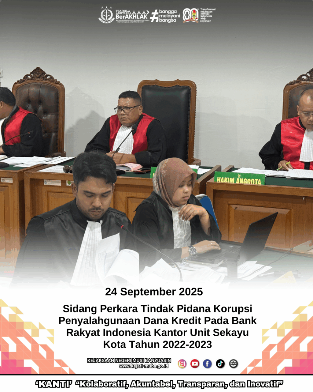 Pada hari Rabu tanggal 24 September 2025 pukul 18.30 wib s/d selesai di Pengadilan Negeri Kelas 1A Palembang telah dilaksanakan Sidang Perdana Perkara Tindak Pidana Korupsi Penyalahgunaan Dana Kredit Pada Bank Rakyat Indonesia Kantor Unit Sekayu Kota Tahun 2022-2023. Bahwa Terdakwa yang menjalani Persidangan Hari Ini adalah YE