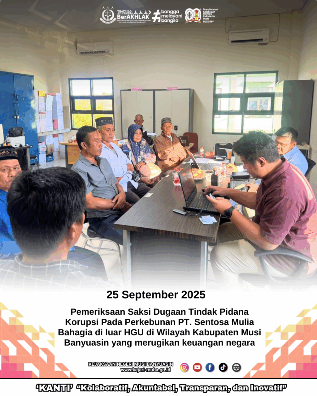 Kamis, 25 September 2025, Tim Badan pengawasan Keuangan dan Pembangunan (BPKP) Palembang melakukan pemeriksaan saksi Dugaan Tindak Pidana Korupsi Pada Perkebunan PT. SMB di luar HGU di Wilayah Kabupaten Musi Banyuasin yang merugikan keuangan negara. Pemeriksaan dilakukan di Ruang Tindak Pidana Khusus Kejaksaan Negeri Musi Banyuasin