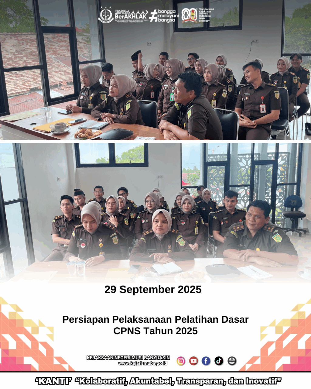 senin, 29 September 2025, Pukul 10.00 s/d selesai, Kejaksaan Negeri Musi Banyuasin menghadiri kegiatan persiapan pelaksanaan pelatihan dasar CPNS Tahun 2025 melalui Zoom Meeting di Ruang Aula Kejaksaan Negeri Musi Banyuasin