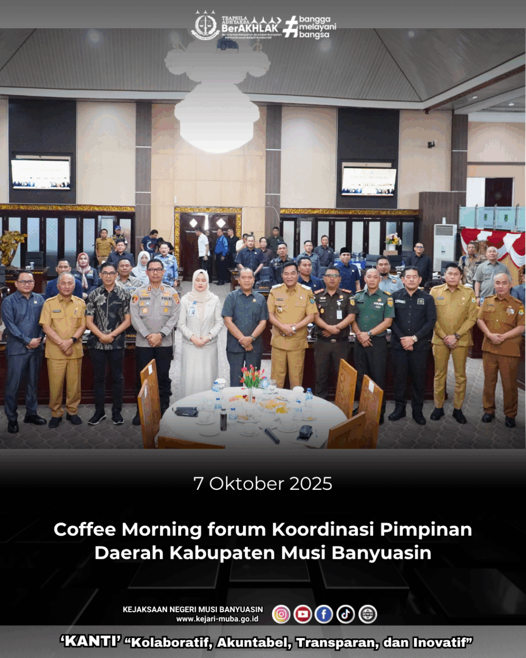 Kepala Kejaksaan Negeri Musi Banyuasin Bapak Aka Kurniawan, SH., MH. Menghadiri Kegiatan Coffee Morning forum Koordinasi Pimpinan Daerah Kabupaten Musi Banyuasin bertempat Ruang Paripurna Sekretariat DPRD Kabupaten Musi Banyuasin.
