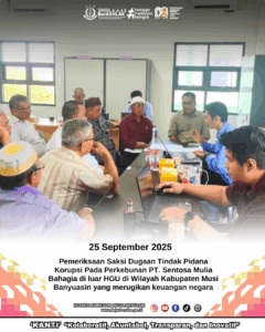 Pemeriksaan Saksi Dugaan Tindak Pidana Korupsi Pada Perkebunan PT. Sentosa Mulia Bahagia di luar HGU di Wilayah Kabupaten Musi Banyuasin yang merugikan keuangan negara