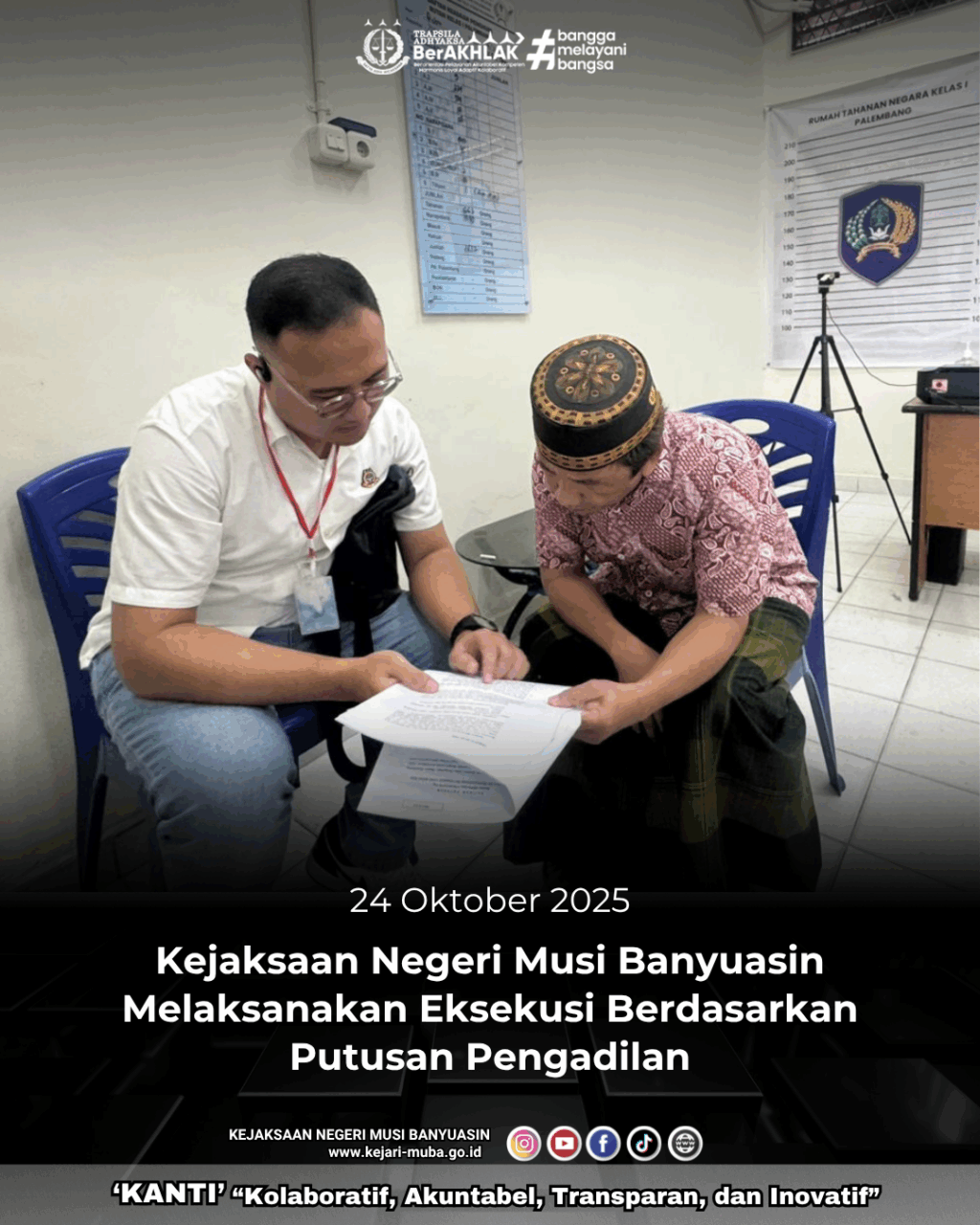 Kejaksaan Negeri Musi Banyuasin telah melaksanakan Eksekusi berdasarkan Putusan Pengadilan yang telah memperoleh kekuatan hukum tetap terhadap satu orang terpidana dalam Perkara Internet Desa Dinas Pemberdayaan Masyarakat Desa Kabupaten Musi Banyuasin, yaitu RA di Lembaga Pemasyarakatan Kelas I Palembang (Pakjo)