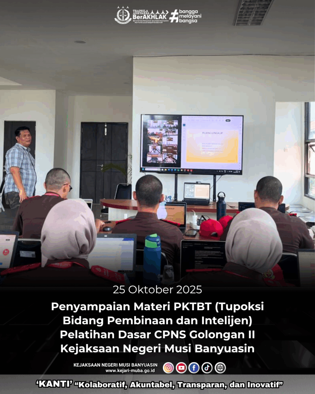 Sabtu, 25 Oktober 2025 pukul 08.00, Telah dilaksanakan kegiatan Penyampaian Materi PKTBT (Tupoksi Bidang Pembinaan dan Intelijen) Pada Latsar Golongan II Kejaksaan Negeri Musi Banyuasin.