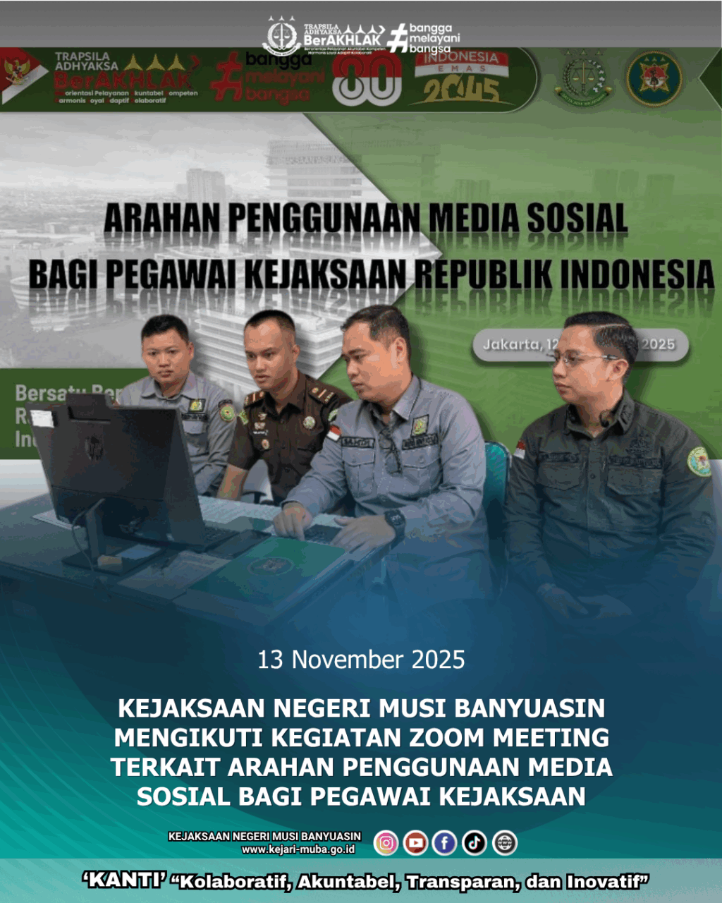 Kamis, 13 November 2025, Pukul 08.00 s/d selesai Kejaksaan Negeri Musi Banyuasin mengikuti kegiatan Zoom Meeting terkait Terkait Arahan Penggunaan Media Sosial Bagi Pegawai Kejaksaan bertempat di Ruang Intelijen Kejari Muba.