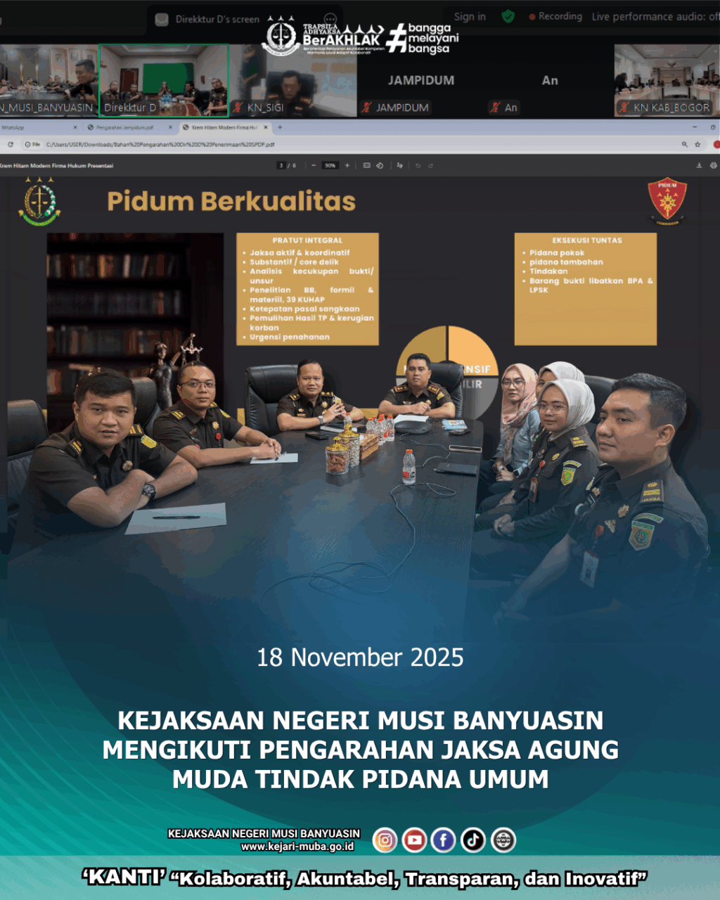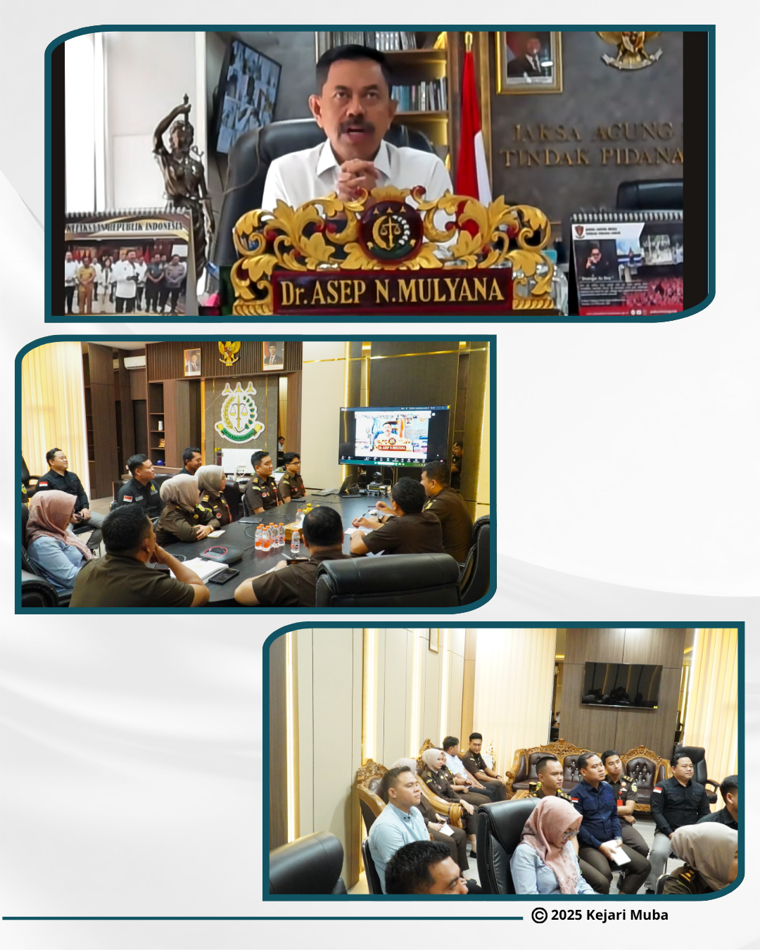 Kejaksaan Negeri Musi Banyuasin Mengikuti Pengarahan Jaksa Agung Muda Tindak Pidana Umum Dalam rangka perumusan dan penyusunan kodifikasi Pedoman Jaksa Agung Republik Indonesia tentang Penanganan Perkara Tindak Pidana Umum sebagai persiapan implementasi KUHP Nasional melalui Zoom Meeting.
