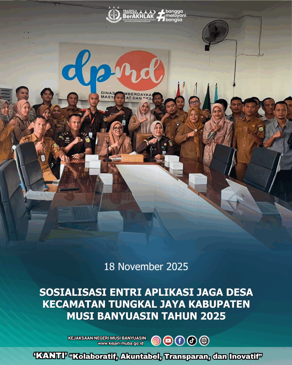 Selasa, 18 November 2025, Kejaksaan Negeri Musi Banyuasin mengikuti kegiatan Sosialisasi Entri Aplikasi Jaga Desa Kabupaten Mus Banyuasin Tahun 2025 yang diselenggarakan di Dinas Pemberdayaan Masyarakat dan Desa Kabupaten Musi Banyuasin.