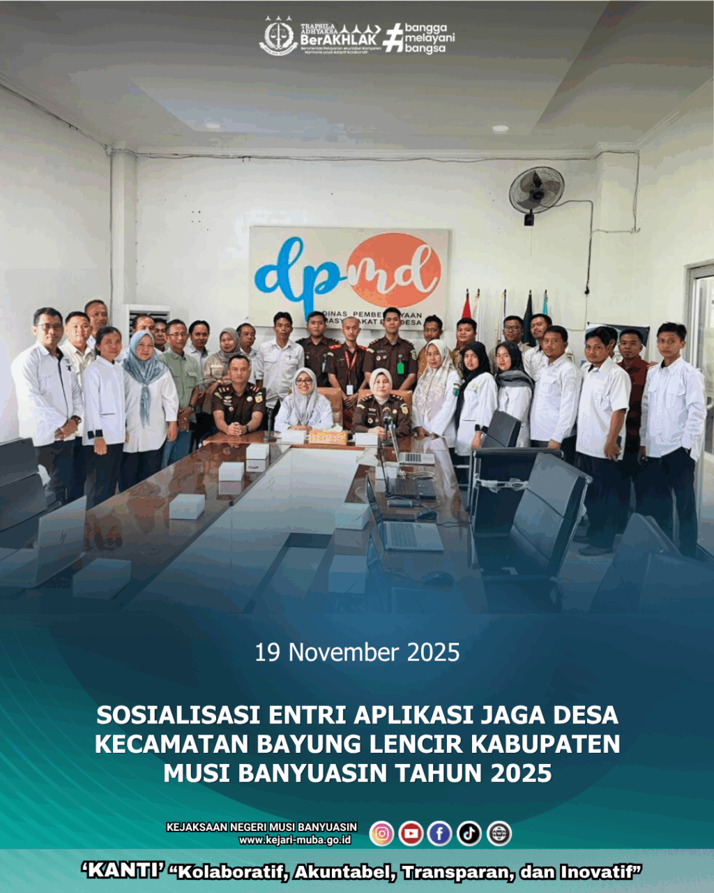 Rabu, 19 November 2025, sekira pukul 10.00, Kejaksaan Negeri Musi Banyuasin mengikuti kegiatan Sosialisasi Entri Aplikasi Jaga Desa Kabupaten Mus Banyuasin Tahun 2025 yang diselenggarakan di Dinas Pemberdayaan Masyarakat dan Desa Kabupaten Musi Banyuasin.