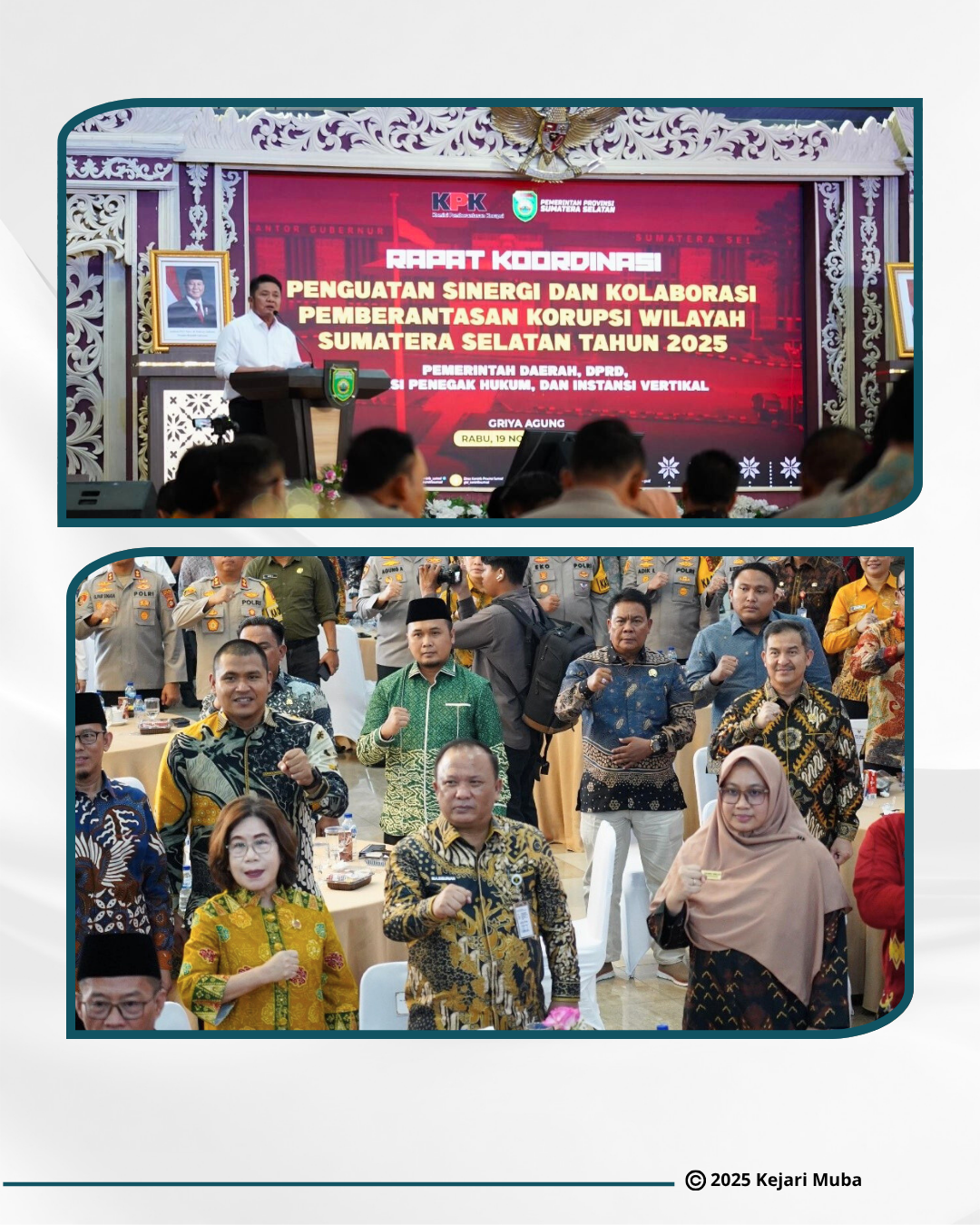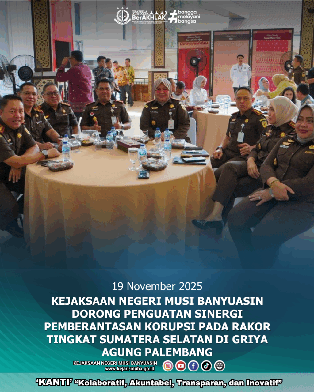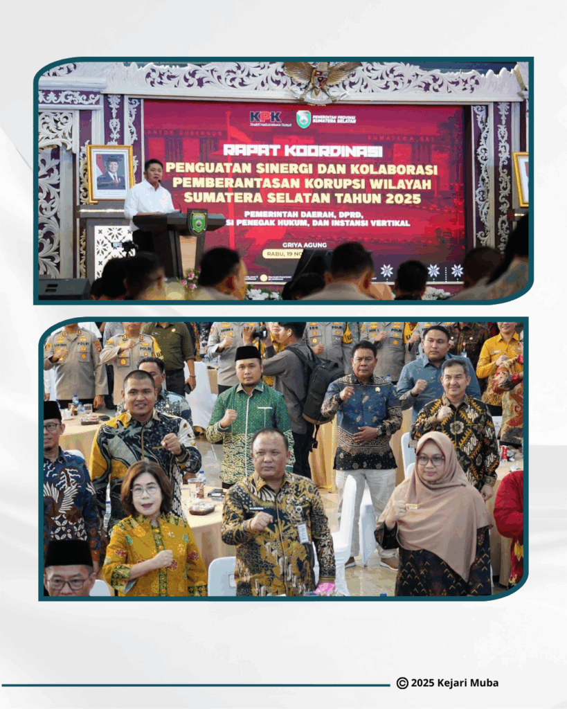 Kepala Kejaksaan Negeri Musi Banyuasin Bapak Aka Kurniawan S.H., M.H turut berpartisipasi dalam Rapat Koordinasi Penguatan Sinergi dan Kolaborasi Pemberantasan Korupsi Pemerintah Daerah Wilayah Sumatera Selatan, yang diselenggarakan pada Rabu, 19 November 2025 bertempat di Griya Agung Palembang.