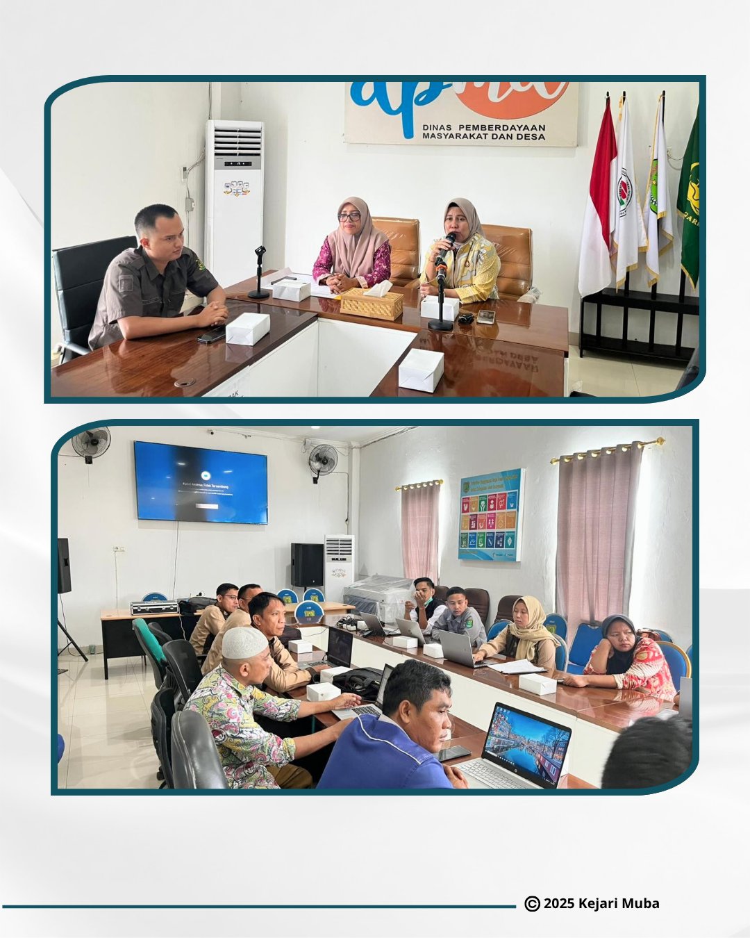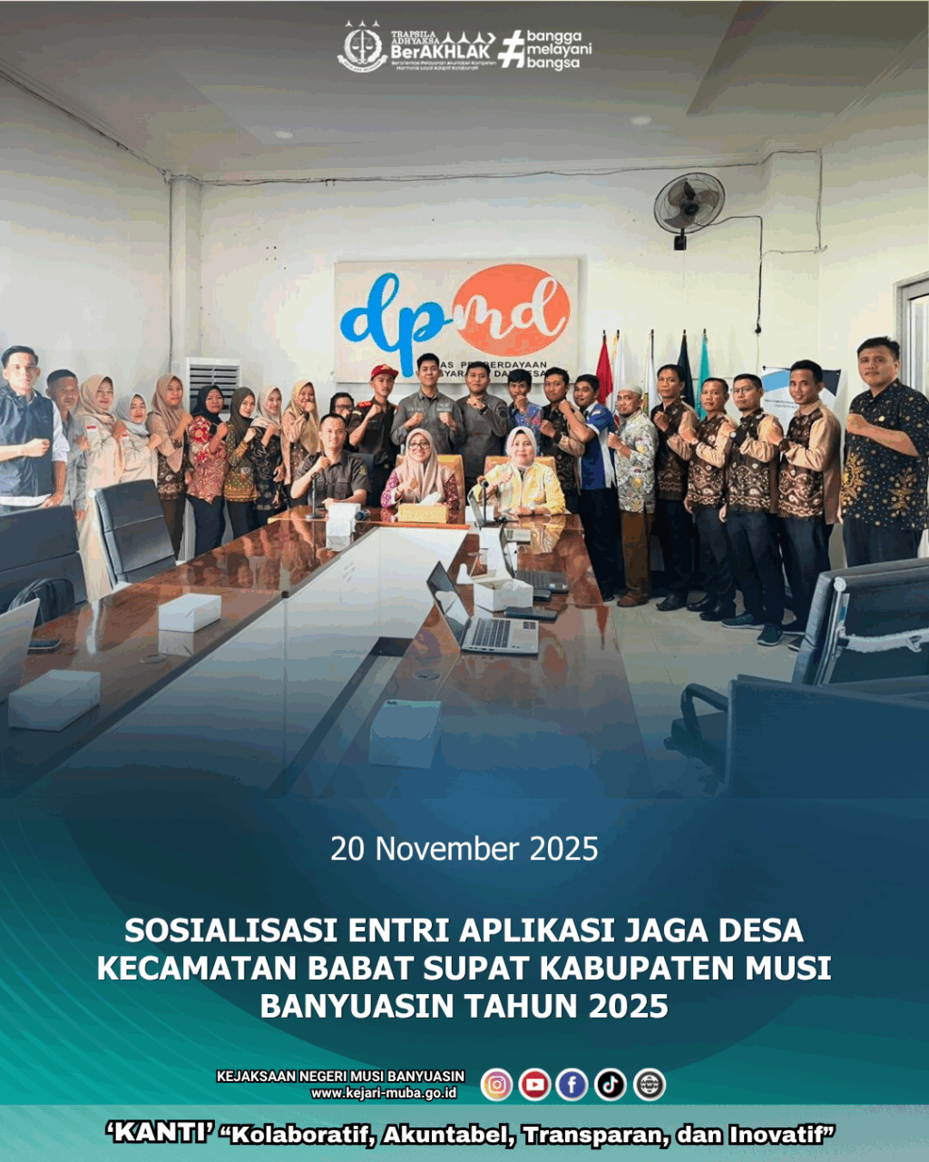 Kamis, 20 November 2025, Kejaksaan Negeri Musi Banyuasin mengikuti kegiatan Sosialisasi Entri Aplikasi Jaga Desa Kabupaten Mus Banyuasin Tahun 2025 yang diselenggarakan di Dinas Pemberdayaan Masyarakat dan Desa Kabupaten Musi Banyuasin. Bahwa kegiatan ini dikoordinasi oleh Ibu Renny Ertalina, S.H. (Jaksa Fungsional Bidang Intelijen Kejaksaan Negeri Musi Banyuasin), Lanai Dam Kuba,S.H. (Jaksa Fungsional Bidang Intelijen Kejaksaan Negeri Musi Banyuasin), Staff Intelijen Kejaksaan Musi Banyuasin sebagai operator aplikasi Jaga Desa dan seluruh sekretaris desa Kecamatan Babat Supat Kabupaten Musi Banyuasin. Adapun tujuan dari kegiatan ini adalah untuk memberikan pelatihan mengenai tata cara penggunaan atau entri data Aplikasi Jaga Desa, serta membantu sekretaris desa jika ada pertanyaan terkait entri data.