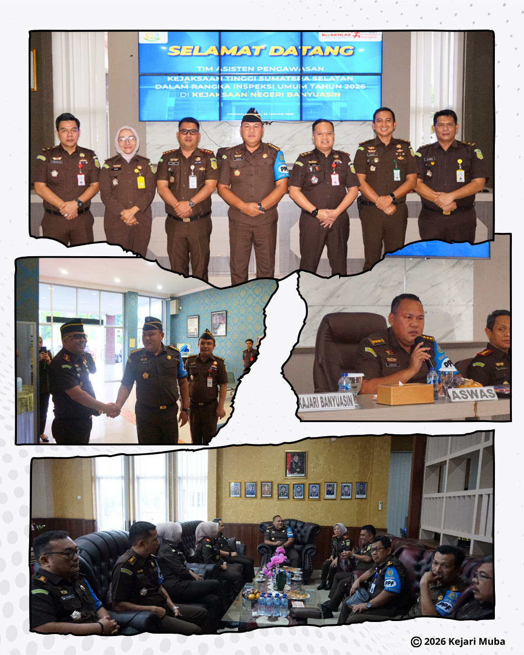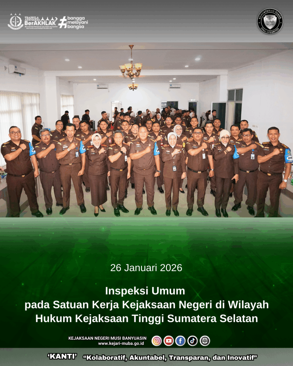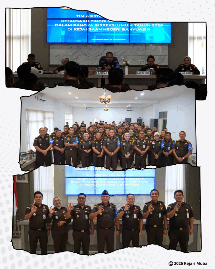 Banyuasin, 26 Januari 2026 Kejaksaan Tinggi Sumatera Selatan melaksanakan Inspeksi Umum pada Satuan Kerja Kejaksaan Negeri di Wilayah Hukum Kejaksaan Tinggi Sumatera Selatan, yang dilaksanakan secara terpusat di Kejaksaan Negeri Banyuasin. Kegiatan Inspeksi Umum tersebut dipimpin langsung oleh Asisten Pengawasan Kejaksaan Tinggi Sumatera Selatan, Bapak Farhan, S.H., M.H., beserta Tim Inspeksi, sebagai bagian dari pelaksanaan fungsi pengawasan internal guna memastikan tertib administrasi, kepatuhan terhadap peraturan perundang-undangan, serta peningkatan kinerja aparatur Kejaksaan.