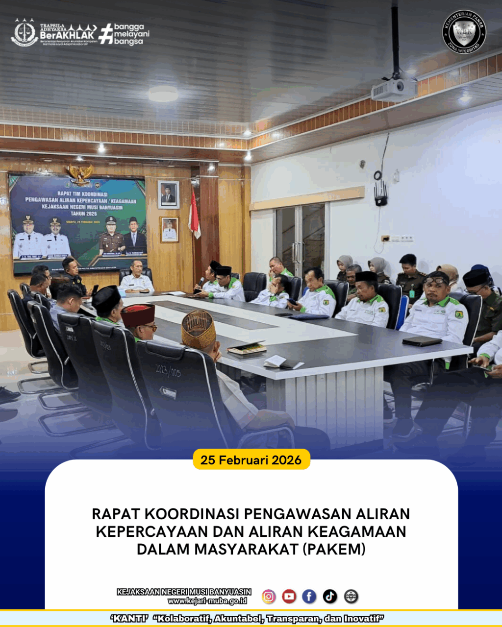 Rabu, 25 Februari 2026 Rapat Koordinasi Pengawasan Aliran Kepercayaan dan Aliran Keagamaan dalam Masyarakat (Pakem) bertempat di Kantor Kesbangpol Kabupaten Musi Banyuasin.Â