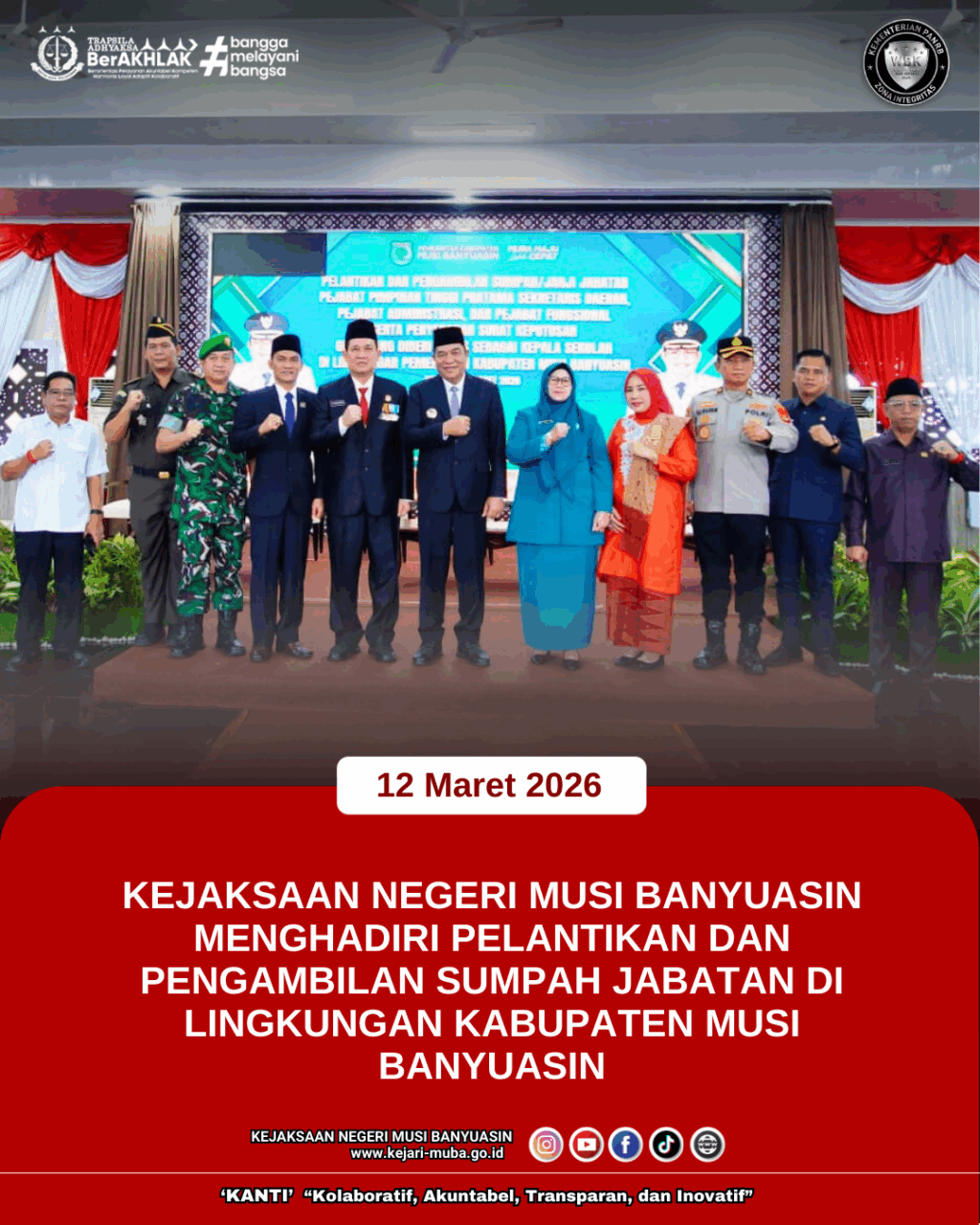 Kamis 12 Maret 2026 bertempat di Pendopoan Griya Bumi Serasan Sekate telah dilaksanakan Pelantikan dan Pengambilan Sumpah Pejabat Pimpinan Tinggi Pratama Sekretaris Daerah, Pejabat Administrasi dan Pejabat Fungsional serta Kepala Sekolah pada Pemerintah Kabupaten Musi Banyuasin Tahun 2026, Yang dihadiri Oleh Kepala Kejaksaan Negeri Musi Banyuasin diwakilkan Oleh Kepala Subbagian Pembinaan Bapak M. Asroni, S.H.