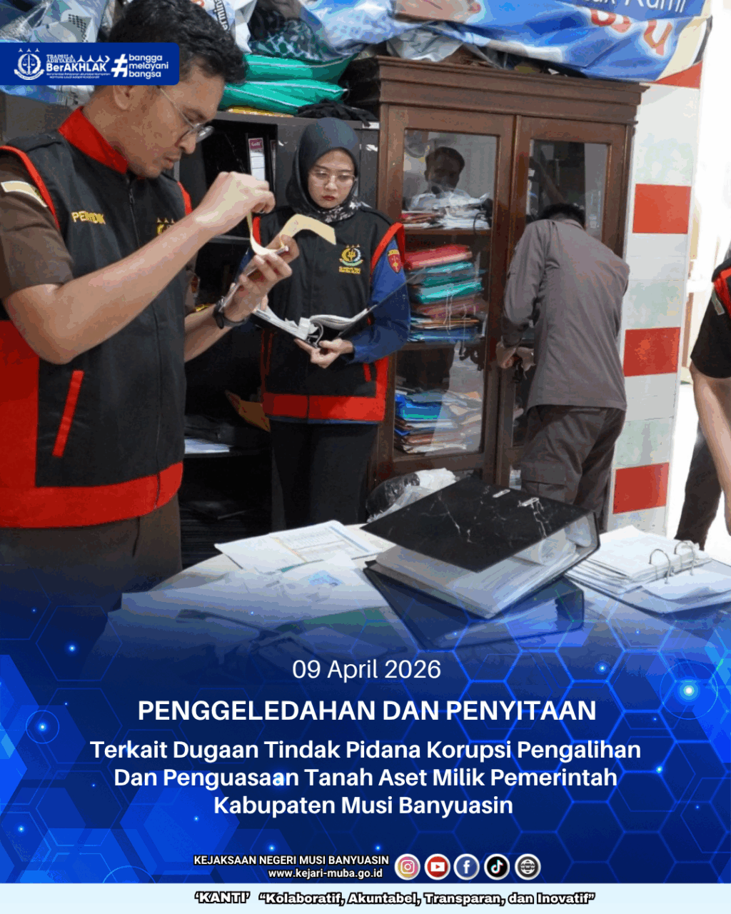 Bahwa Kepala Kejaksaan Negeri Musi Banyuasin memerintahkan Penggeledahan ini dalam rangka kepentingan penyidikan Terkait Pengalihan Dan Penguasaan Tanah Aset Milik Pemerintah Kabupaten Musi Banyuasin yang terletak di Kecamatan Sekayu Berdasarkan Sertipikat Hak Pakai Nomor 09 Tahun 2009 Sebagaimana sesuai pada Surat Perintah Penyidikan Kepala Kejaksaan Negeri Musi Banyuasin Nomor : PRINT 35/L.6.16/Fd.1/04/2026 tanggal 1 April 2026, Surat Perintah Penggeledahan Nomor : PRINT-500/L.6.16/Fd.1/04/2026 tanggal 09 April 2026 dan Surat Penetapan Izin Penggeledahan Pengadilan Negeri Sekayu Nomor : 87/PenPid.B-GLD/2026/PN Sky Tanggal 09 April 2026.