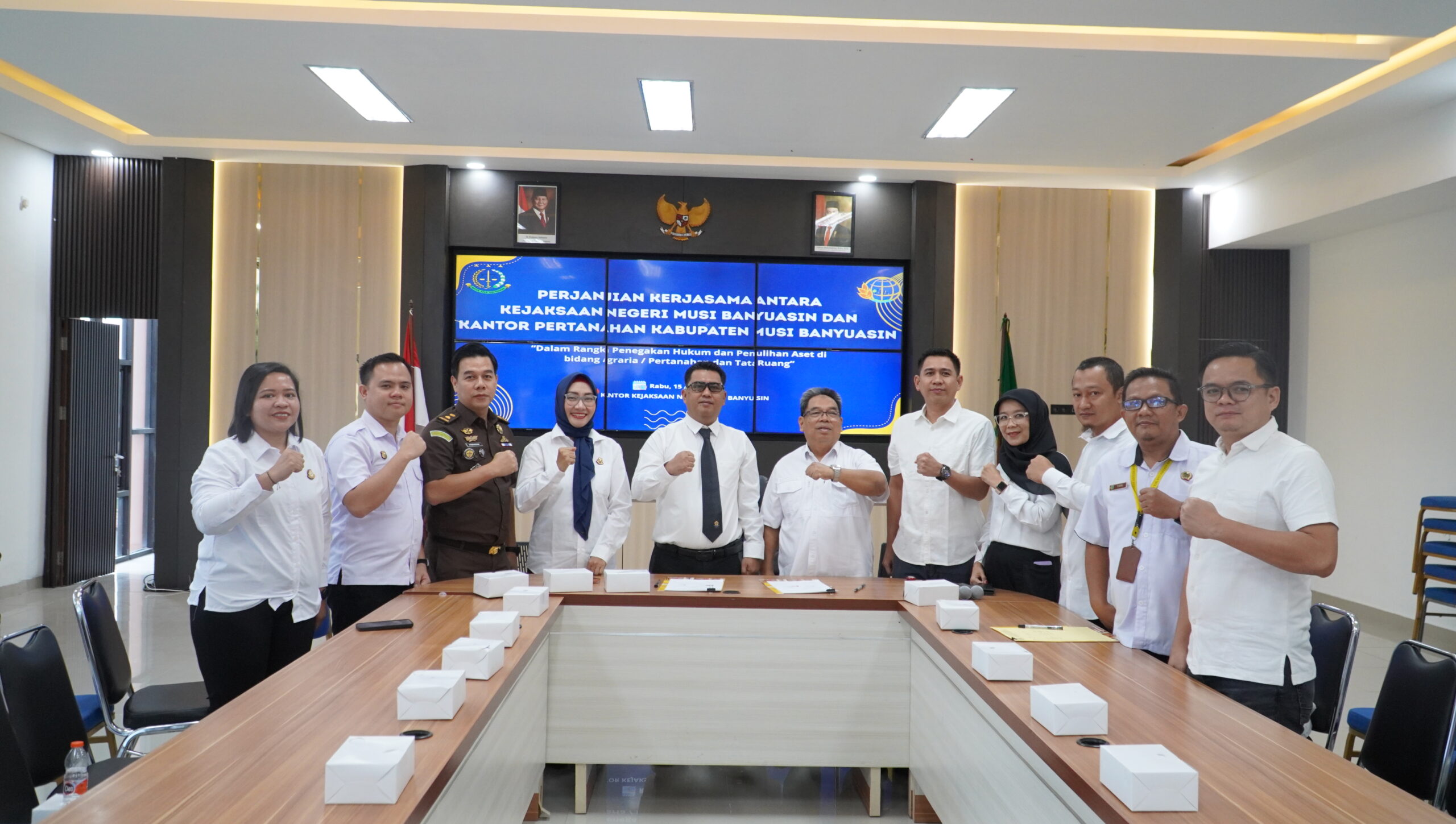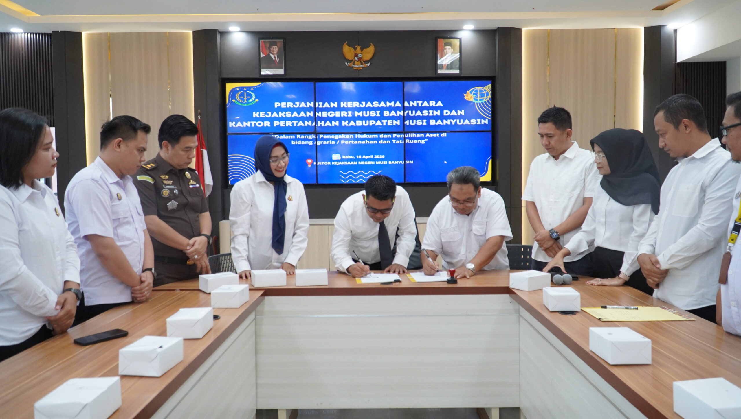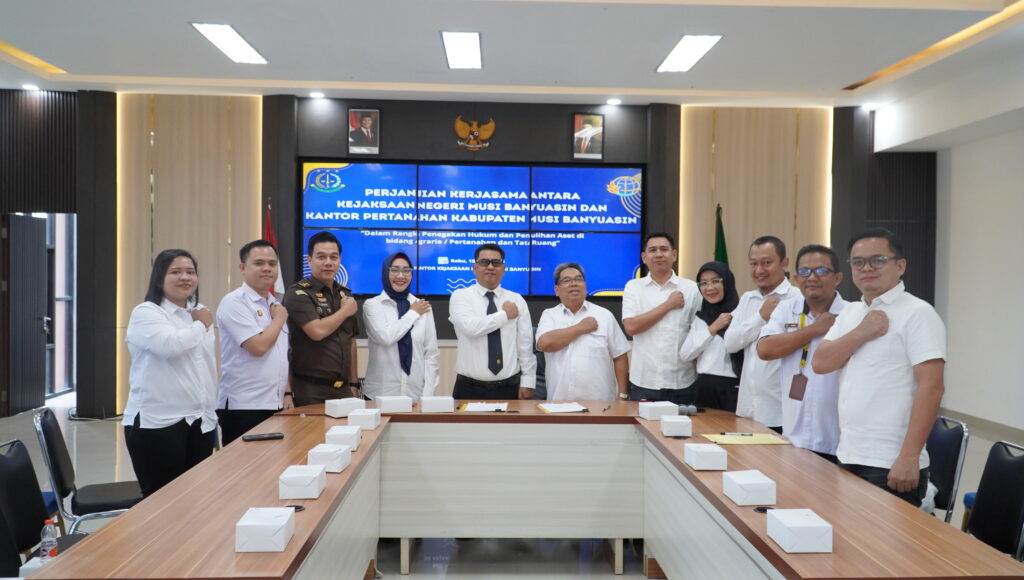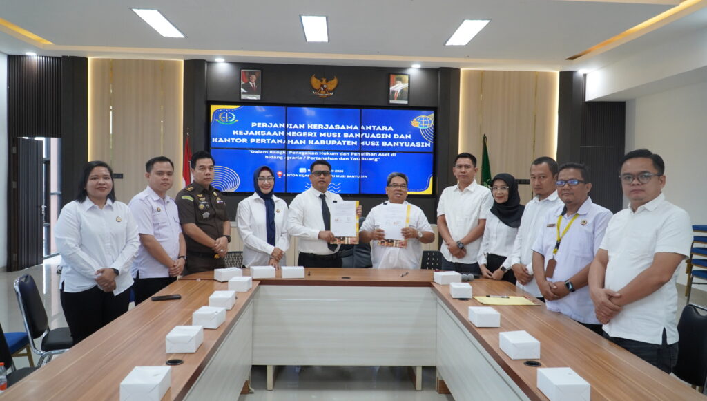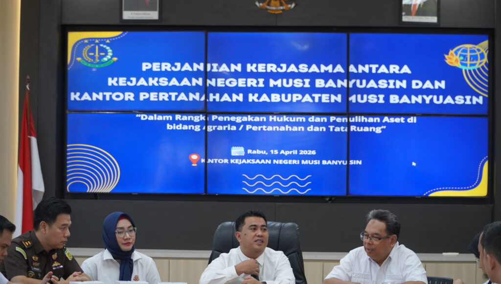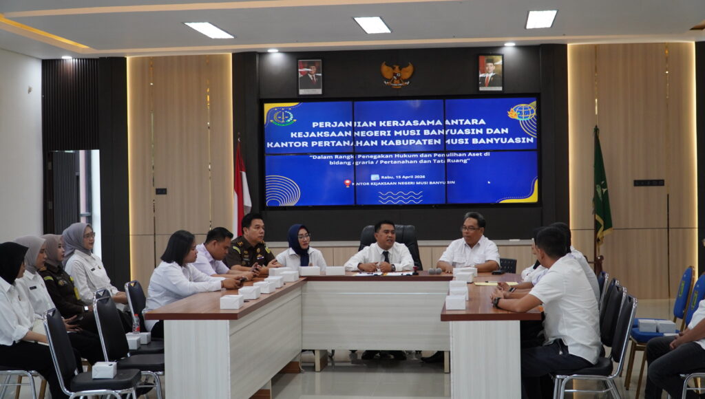 Pada hari Rabu, 15 April 2026 pukul 08.00 WIB, bertempat di Aula Kantor Kejaksaan Negeri Musi Banyuasin, telah dilaksanakan kegiatan penandatanganan Perjanjian Kerjasama (MoU) antara Kejaksaan Negeri Musi Banyuasin dengan Kantor Pertanahan (BPN) Kabupaten Musi Banyuasin. Kegiatan ini dihadiri langsung oleh Kepala Kejaksaan Negeri Musi Banyuasin, Dr. Aka Kurniawan, S.H., M.H., didampingi Kepala Seksi Perdata dan Tata Usaha Negara (Datun), Ibu Silvia Margaretha, S.H., serta Kepala Kantor Pertanahan Kabupaten Musi Banyuasin, Bapak Rosidi.
